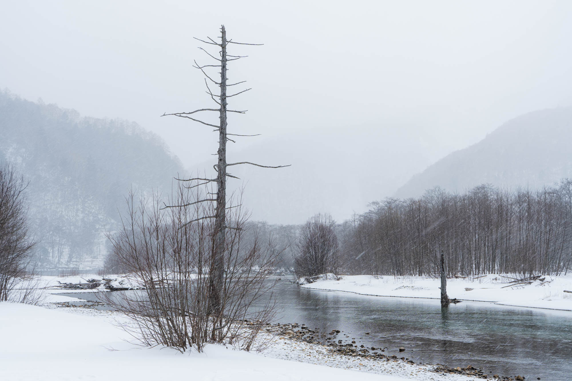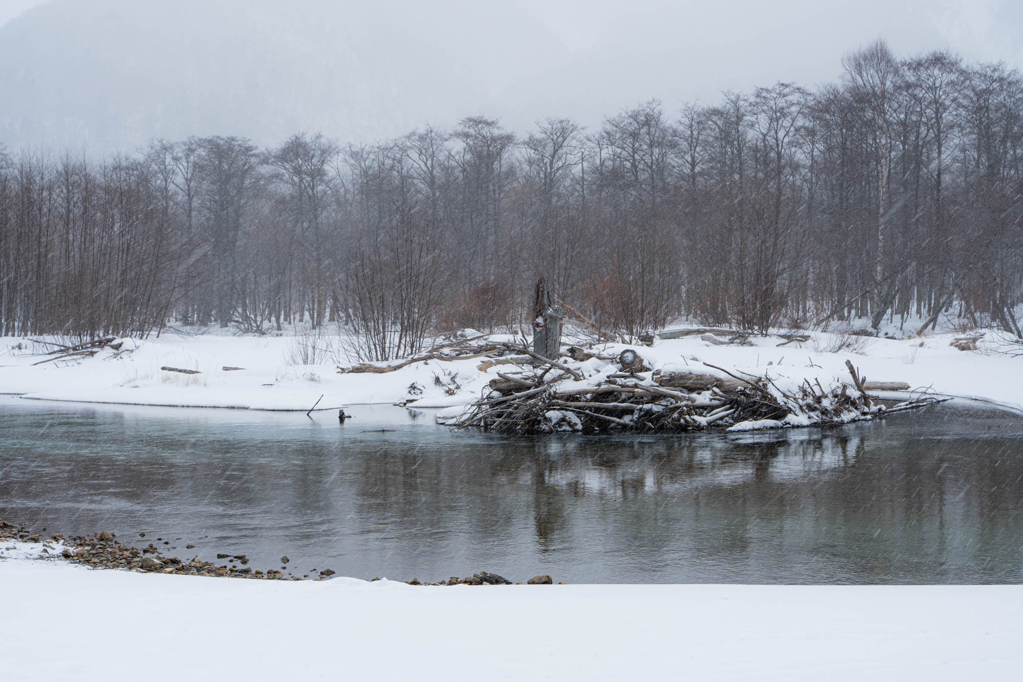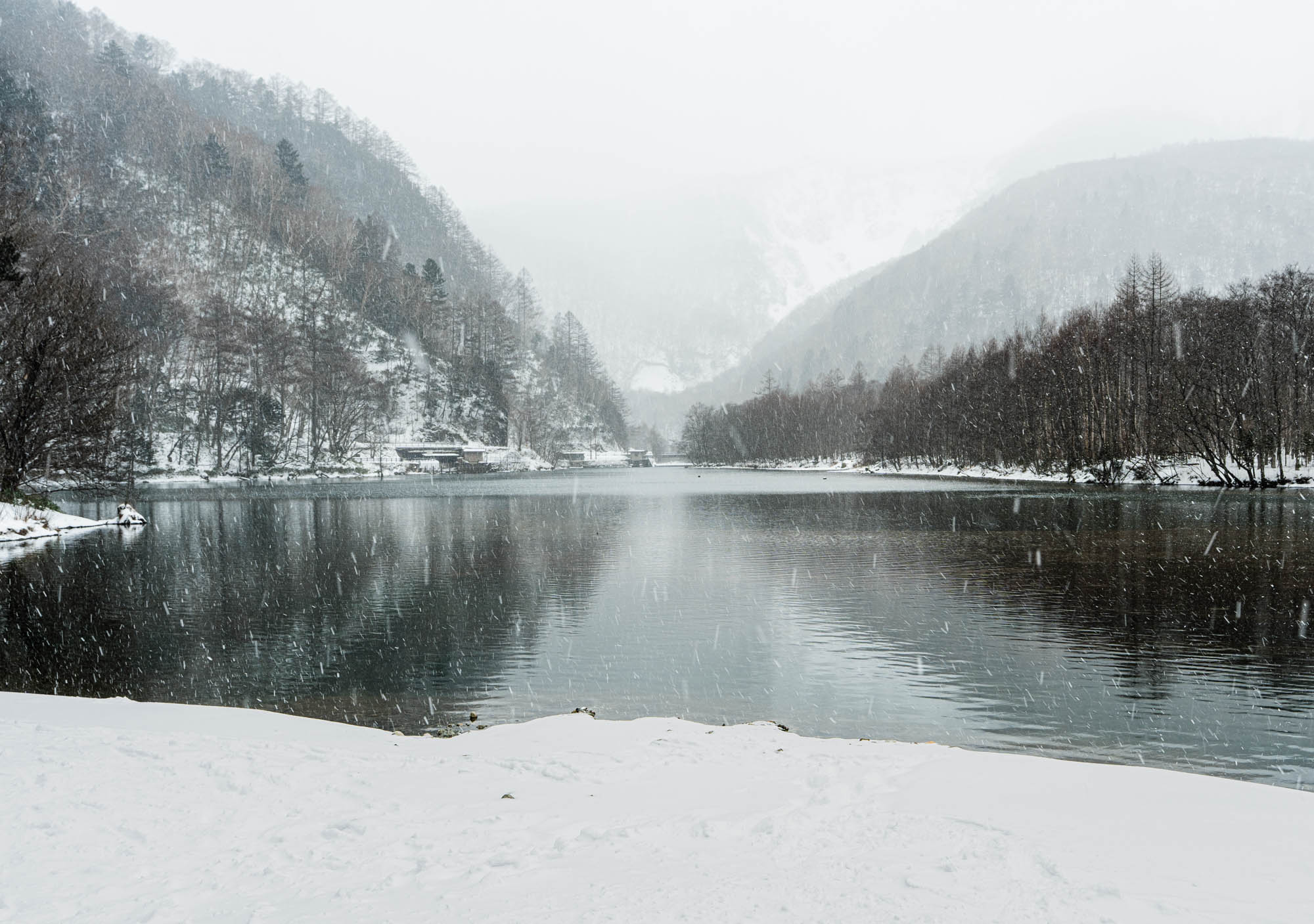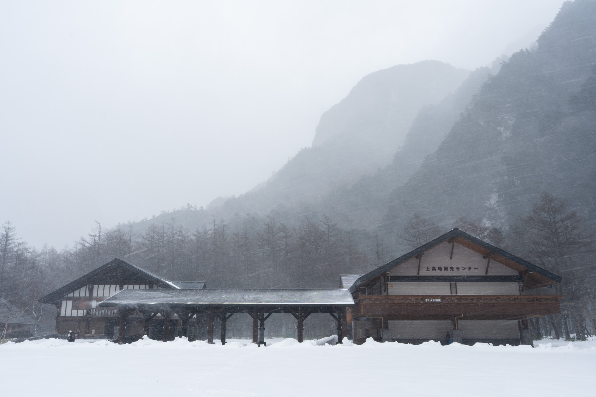 Parts of the trail along the Azusa River were closed, which was a bit of a letdown, so I ended up taking the road normally used by vehicles to get to Kappabashi (河童橋). It would’ve been completely dull if not for the falling snow.